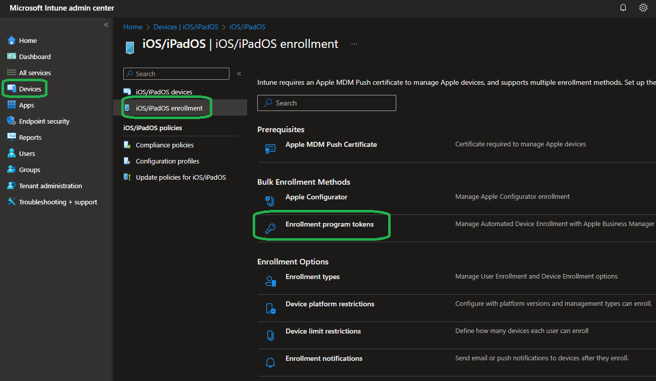 Next we start with the Shared iPad configuration. If you never created a profile in this way (where you of course need an Apple Business Manager account attached to your Intune) then navigate to „Devices“ -> „iOS/iPad OS enrollment“ -> „Enrollment program tokens“…