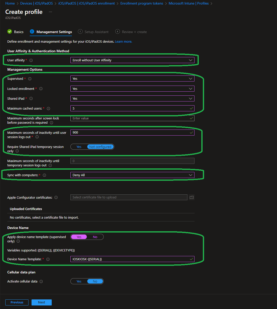 Next we configure the iOS OOBE to make the iPad a SharedIpad. The important step here is to set „Shared iPad“ to Yes and pick how many users you want to locally store and after which time of inactivity a user gets signed out. 900 seconds equals 15 minutes for this example here. The other options depend on your usage scenario: