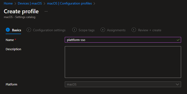 To start configuring the new Platform SSO feature we need to create a new settings catalog profile for macOS. Firstly define a name for the profile: