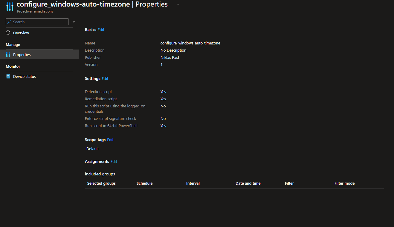So now that we have the device enabled to use its location we need to tell it to use this for the time zone settings. Therefore I created a small Intune Remediation that enables the „tzautoupdate“ service and cunfigures it in the Windows registry to use the location as an indicator.