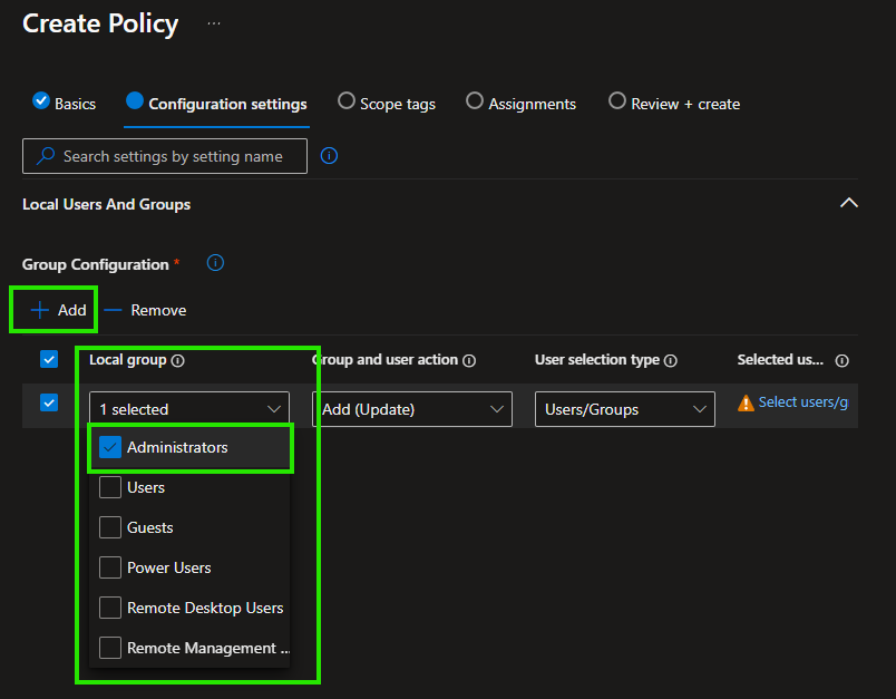 Now click on + Add and choose one of the well-known local groups from Windows.