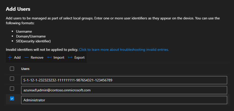 This example policy has the SID from an Entra ID group, followed by an Entra ID user and the local Administrator account.