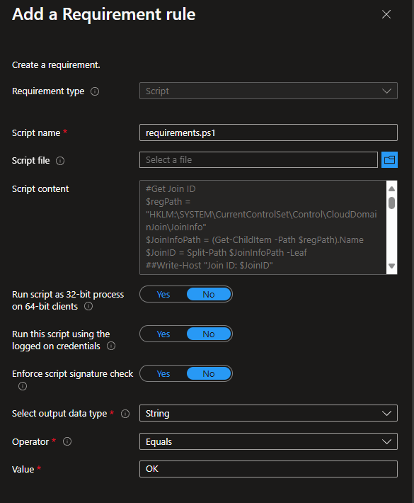 With this post I want to share how i got a solution for that as I think this is a nice and easy way. If you did not knew it yet, in Microsoft Intune when you create an app you can set requirements as the os architecture or free storage that needs to be fullfilled for an app to install. And if your requirements cannot be configured in this simple UI in Intune….they gave us the option to write custom powershell scripts to require whatever we need for an app to install.