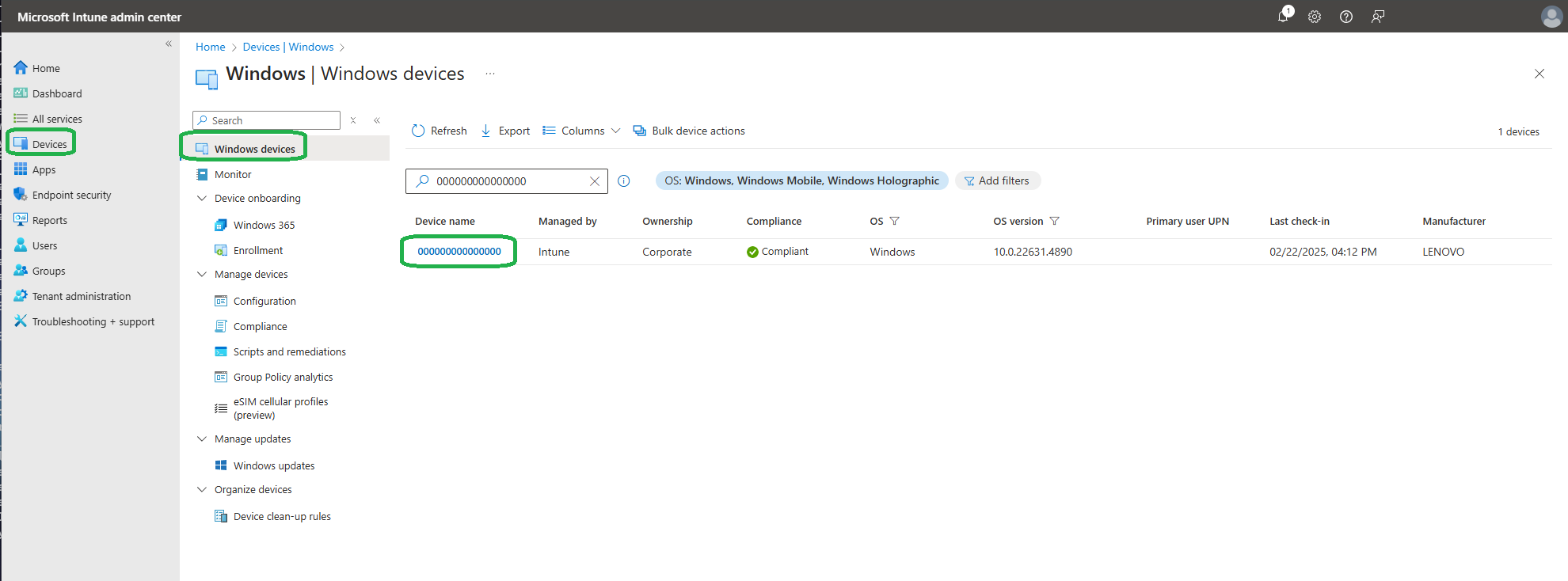 Firstly we need to open the Intune Portal and navigate to Windows devices, from there we need to open the device where we want to look into: