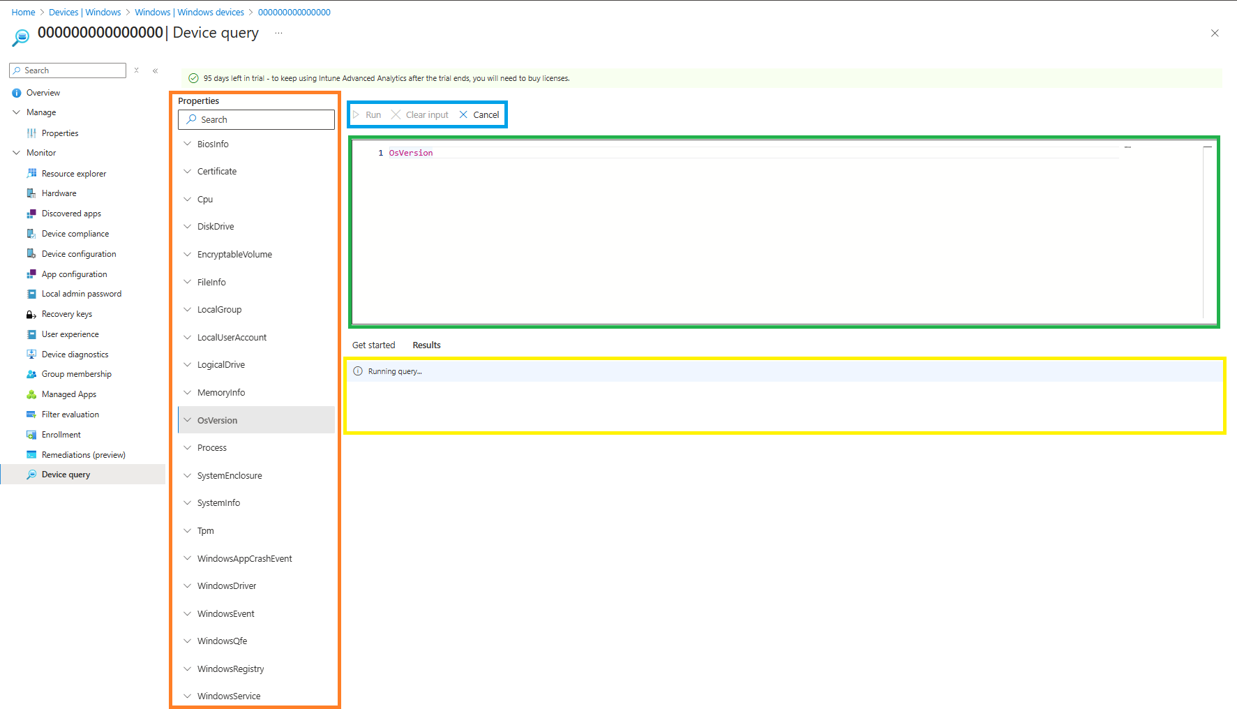 As you can see we have multiple properties (orange section) that we can use with KQL. Those or just the class as in this example can be added to the command box (green section) and then youre able to Run it from above the command box (blue section). As this query is send directly to the device it can take some time - dont leave the view as this would cancle the query.