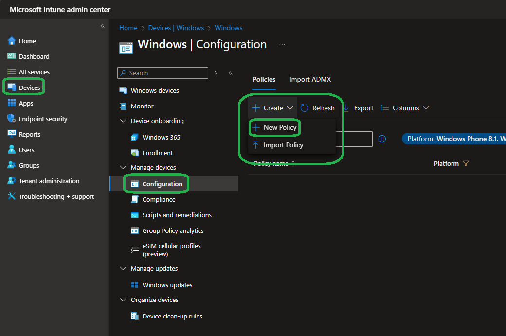 Open the Intune portal and navigate to Configuration under Windows in the Devices blade. Here create (or edit an existing one) a settings catalog policy: