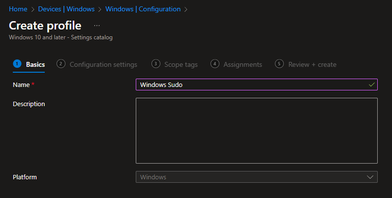 First of all we need to start by configuring the sudo command. To do so we are going to create (or edit an existing one - how ever you like) a settings catalog policy in Microsoft Intune for our Windows devices.