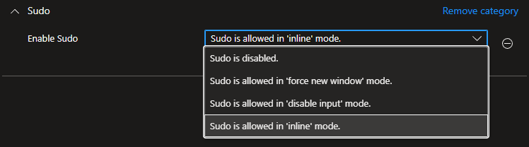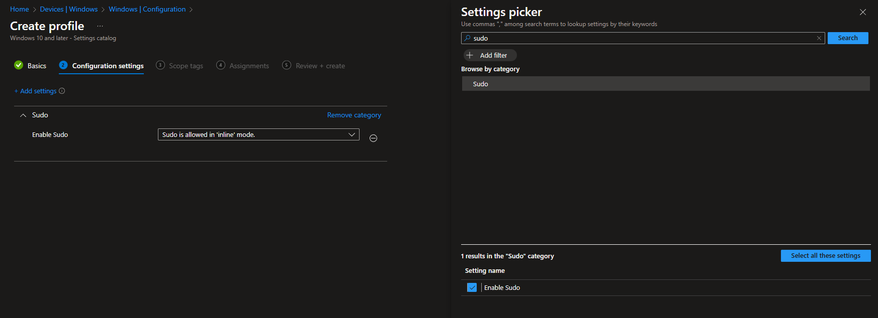 Next, search for sudo in the settings picker and add Enable sudo to our policy: